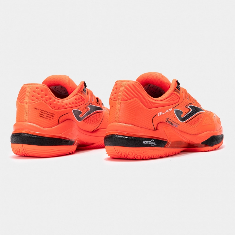 Noul model Joma Slam Padel Pro a fost complet reproiectat pentru jucătorii profesioniști care caută aderență maximă, protecție, stabilitate și amortizare de top. Partea superioară este construită din plasă respirabilă cu finisaj Jacquard și microperforații VTS pentru o ventilație eficientă și o evacuare rapidă a transpirației. Sistemul SPORTECH asigură o ajustare precisă în zonele strategice, iar PROTECTION consolidează partea frontală pentru rezistență la impact. Talpa intermediară păstrează sistemul DUAL REACTIVE, alcătuit din phylon în partea superioară și REACTIVE BALL în partea inferioară, oferind echilibru între amortizare și reactivitate. Piesa STABILIS crește controlul lateral și siguranța. Talpa Omni DURABILITY, cu crampoane circulare și structură ROTATION, permite alunecări controlate și rotații rapide pe terenul de padel.